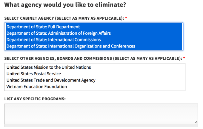 But don’t worry, if you’re gunning to shred the federal government into so much bureaucratic confetti, you’ve got options. Just select what you want to see go in a drop-down menu of cabinet agencies. You can even select-all!