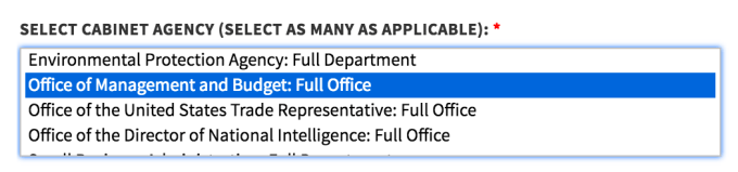Remarkably, the drop-down even includes Trump administration faves like entire Department of Defense (sayonara Air Force!!), the Executive Office of the President (uh?) and the probably inconsequential State Department, reportedly already doing whatever it does with a skeleton crew. Appetite for annihilation not quite sated? An additional menu lets you select such hangers-on as the United States Postal Service and NASA.