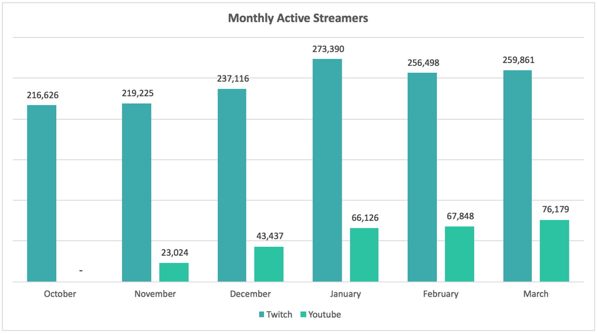 Twitch these days has somewhere north of 250,000 monthly active streamers, and that’s growing in fits and starts; 5,000 this month, 15,000 the next. YouTube added 23,000 its first month, and has grown to around 75,000 (again, monthly actives). That’s healthy growth and its momentum seems far from spent.