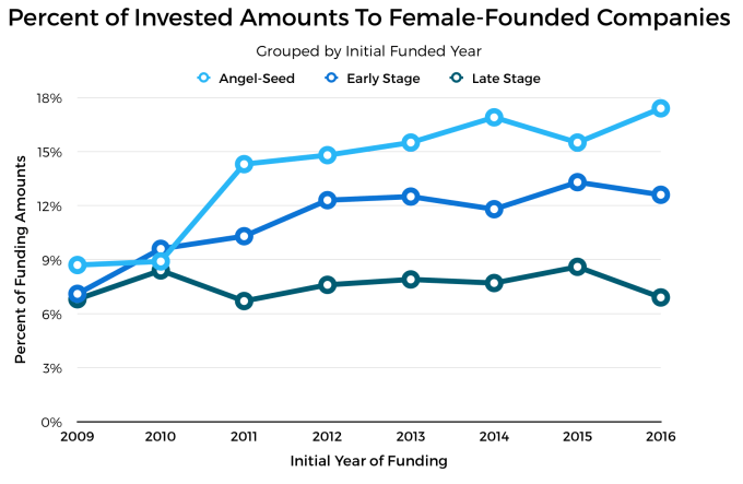 For the same year, female-founded companies raised 17 percent of seed dollars, 13 percent of early-stage dollars and 7 percent of late-stage dollars.