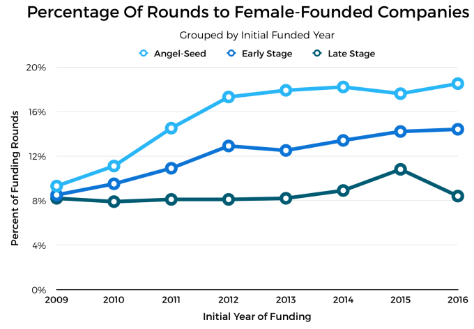 In 2016, companies with at least one female founder raised 19 percent of all seed rounds, 14 percent of early-stage venture and 8 percent of late-stage venture rounds.