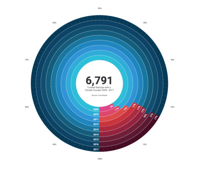 For Crunchbase’s continuing study of female founders, 43,008 global companies with founders had an initial funding between 2009 to 2017. Of these global companies, 6,791 (15.8 percent) have at least one female founder. For this update, we are primarily reviewing year-over-year trends, as data continues to be added to Crunchbase for 2016.
