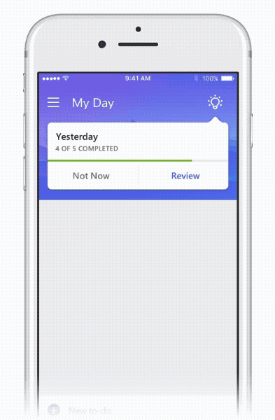 According to Microsoft’s announcement, To-Do starts you off in a screen called “My Day” which offers a list of items that need to get done today. You can customize this list further by accessing the “Intelligent Suggestions” feature – available with a tap on the lightbulb icon – which will offer suggestions of things you may want to add to your list.