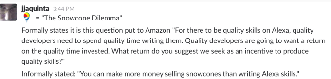 In fact, this problem is so often discussed that there’s an inside joke in an active Slack community for Alexa developers that involves the posting of a snow cone emoji. The joke is that it’s easier to make more money selling snow cones than building Alexa skills. The emoji is posted in response complaints, including, most recently, the change to Amazon’s Alexa Developer agreement.