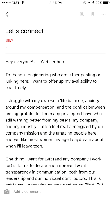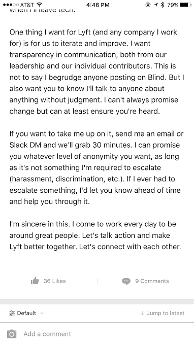 One thing I want for Lyft (and any company I work for) is for us to iterate and improve. I want transparency in communication, both from our leadership and from our individual contributors. This is not to say I begrudge anyone posting on Blind. But I also want you to know I’ll talk to anyone about anything without judgment. I can’t always promise change but can at least ensure you’re heard.