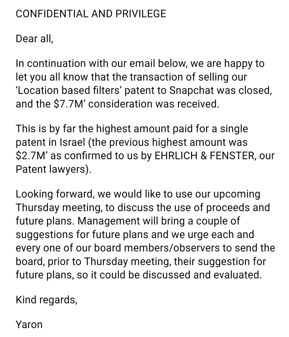 But according to sources, serial entrepreneur and investor Moshe Hogeg, who co-founded Mobli, sold Mobli’s Geofilters patent to Snap this month for $7.7 million. This is believed to be the highest amount paid for a patent from the Israeli tech industry. The news was confirmed in an email to Mobli’s 100 shareholders and obtained by TechCrunch in the form of a screen grab, displayed below: