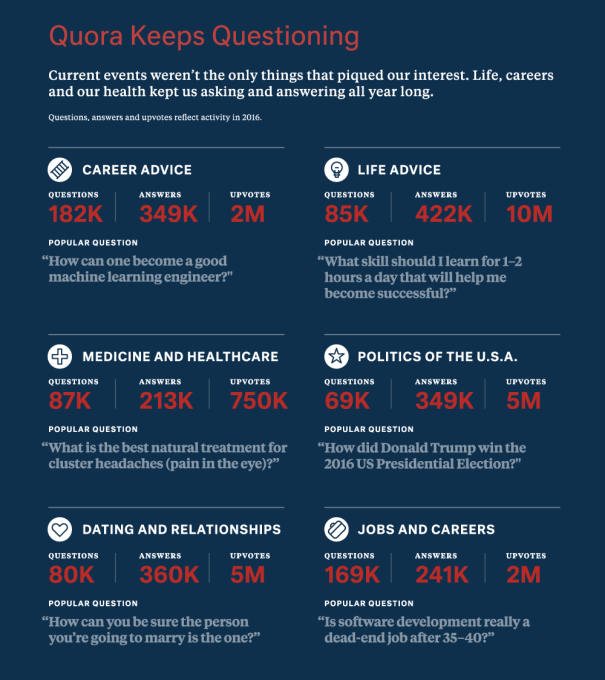 Quora does have to contend with Yahoo Answers Now, which is the veteran of the Q&A space despite the unreliable quality of its content. And artificial intelligence could one day offer new ways to aggregate subjective knowledge that cuts out Quora. But the new cash VentureBeat reported on earlier today brings it to a total of $226 million raised, allowing Quora to keep playing its long game.