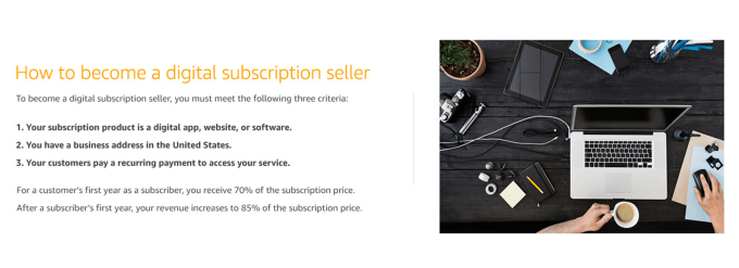 The commission structure is detailed on a page on Amazon’s site (see above), and mirrors the one used today by the Apple App Store. In the first year, Amazon takes a 30 percent cut of the subscription sales, which drops down to 15 percent after the one-year mark.