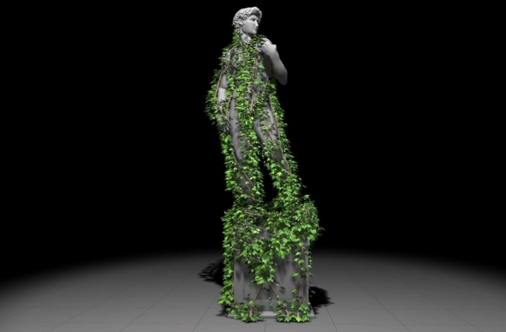 First is a system for simulating vines and creepers as they grow in complex interweaving patterns. The plants are a series of particles that interact with their immediate environment — angle, material, light exposure, other plants — and grow appropriately. The video shows the simulation without plant trappings, and it looks like intelligent sausage links.