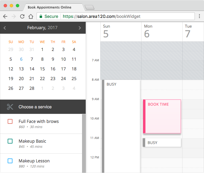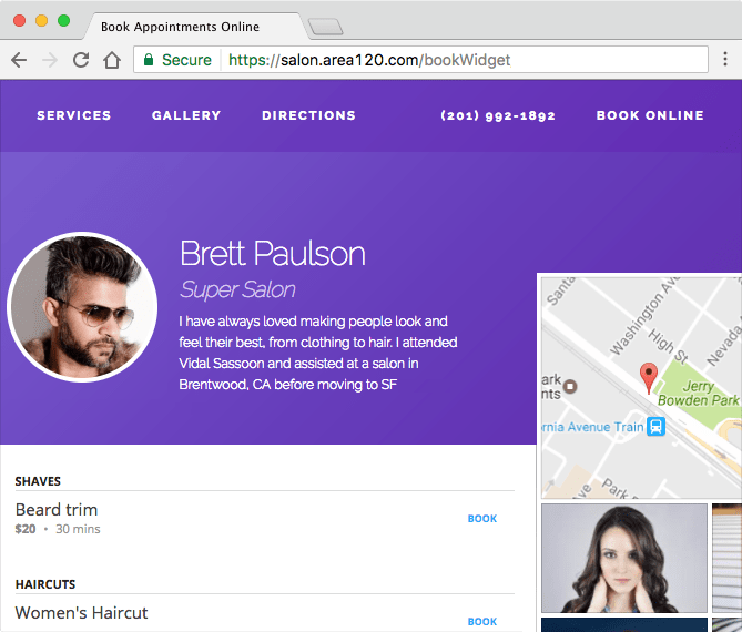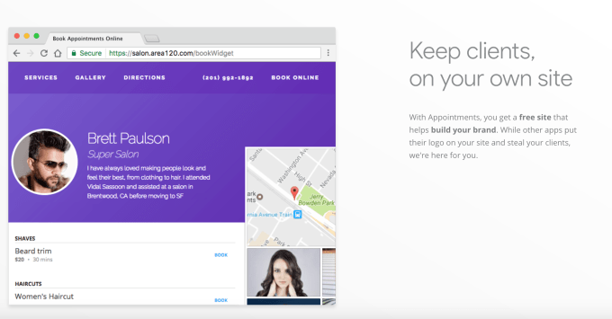 The website and bookings app work online or via mobile devices, the site says, and will display to customers a week’s worth of availability. The business website, meanwhile, can also include other information, like the services offered at that location, directions and a map, photo gallery, price list, and contact information, like the address and phone number, for example.