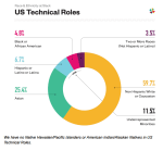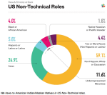 In technical roles, people of color make up 11.4 percent of employees. You may remember that Slack at one point reported 8.9 percent of its engineering team was black and 6.9 percent of its technical team was black. You may now notice that its technical team is just 4.8 percent black and that the engineering department is included in the technical team breakdown.