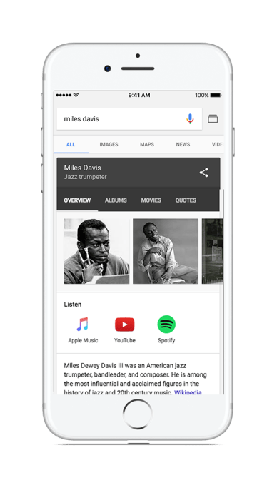 For music searches, Google will now offer links to streaming services like Apple Music, Spotify and Pandora, also right from the Knowledge Panel that appears in search results for artists.