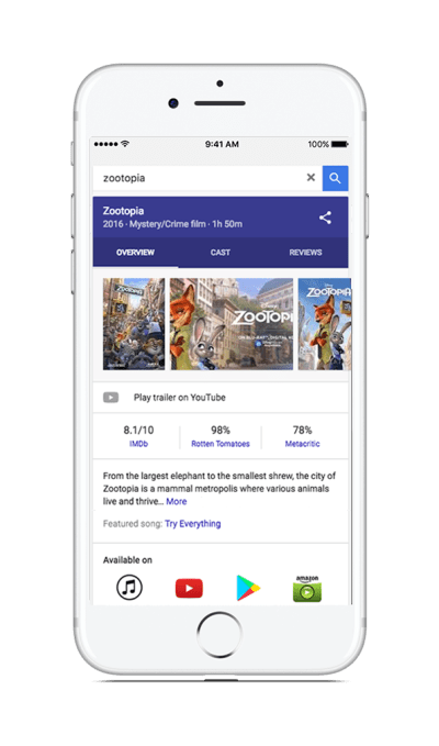 For example, if you search for a movie title on iOS, the Knowledge Panel box at the top of the search results will offer details about the film, like its description, its cast, plus photos and reviews. Beneath this, it will now show where you can view the movie right now, by listing the services that have it available for streaming or for sale.
