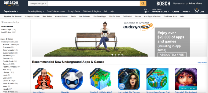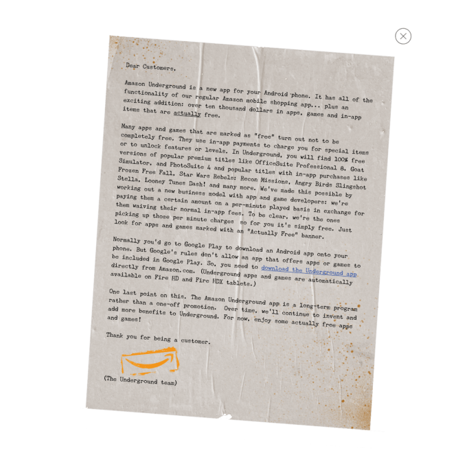 The larger idea with the program was to lure consumers over to Amazon’s own hardware, the Kindle Fire HD and Fire HDX tablets, where the Underground apps were available through Amazon’s built-in Android app store. However, the company also made its Underground apps available to other Android devices through a separate download of an Underground mobile app.