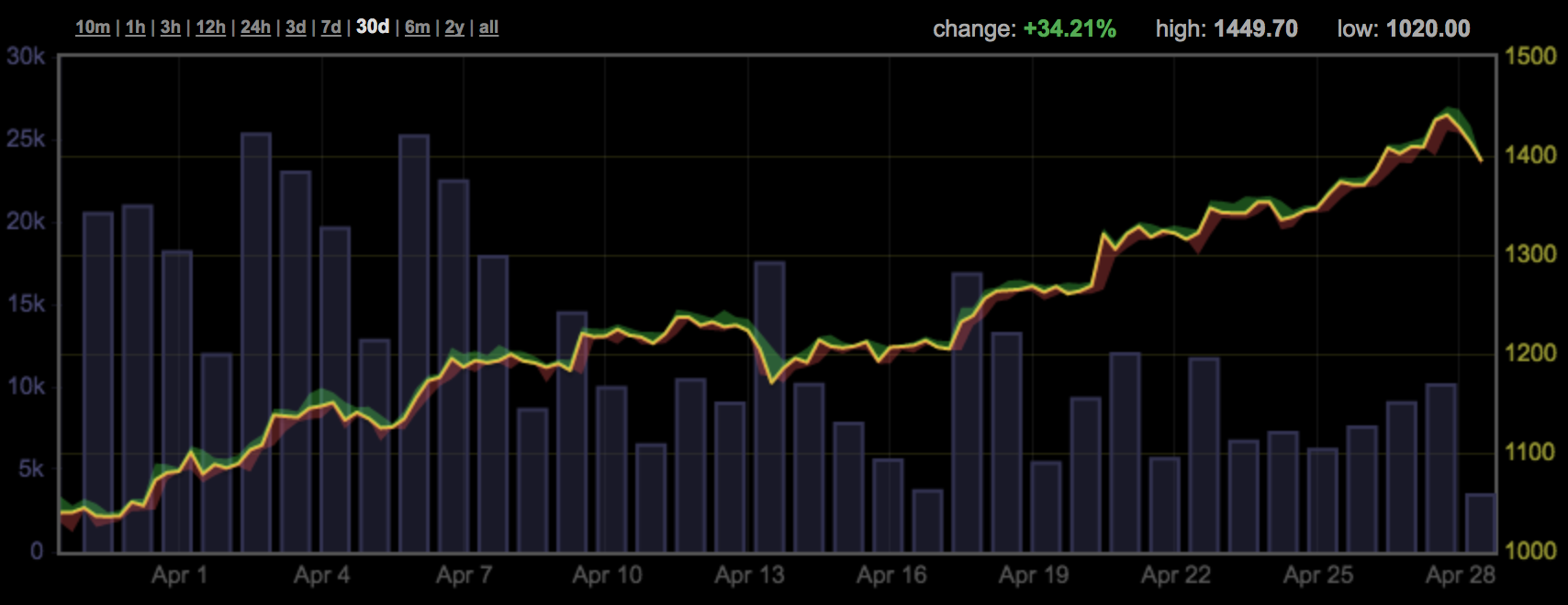 According to Coindesk’s price index, you could buy one bitcoin for $1,343 earlier today. It roughly represents a 6 percent increase in 7 days, and a 34 percent increase in a month.