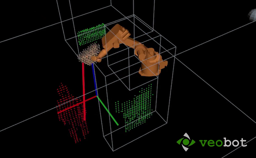 Veo’s system uses a set of four depth-sensing cameras placed around the work space so as to give complete visual coverage. Once you’ve established that, you designate various things as work pieces, forbidden areas and so on.