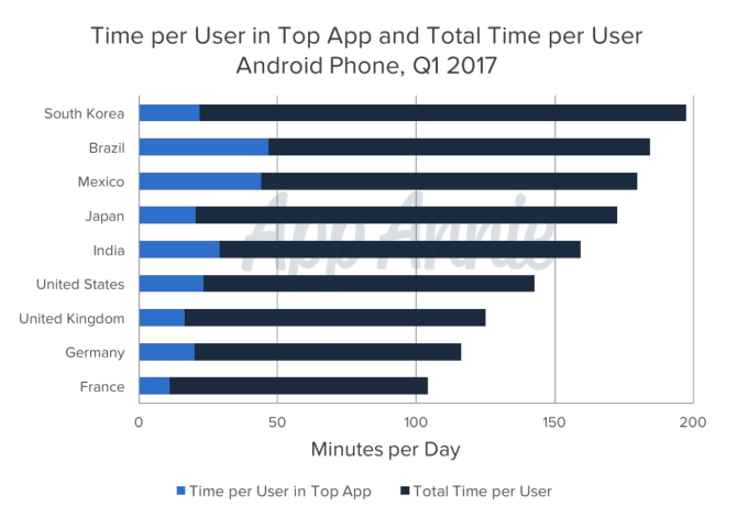 In Brazil and Mexico, half user time was in social and communication apps categories, while in South Korea and Japan, games accounted for 25 percent of usage.