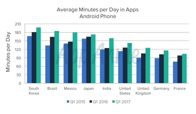 Time spent in apps has also increased over the past two years, App Annie noted. Today, users in the U.S. spend an average of over 2 hours and 15 minutes in apps every day, which amounts to over one month out of the year. In South Korea, Brazil, Mexico and Japan, that number is even higher, with users averaging around 3 hours daily.