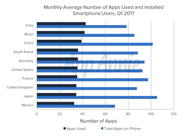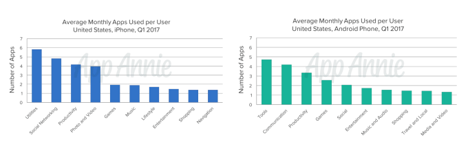 In addition, App Annie’s new numbers back up a prior Nielsen report which claimed there was an upper limit as to how many apps consumers can manage on a monthly basis. Also back in 2015, Nielsen said the consumers used 26 to 27 apps per month. App Annie is noting that trend largely continues, with an average of 30 apps being used monthly.