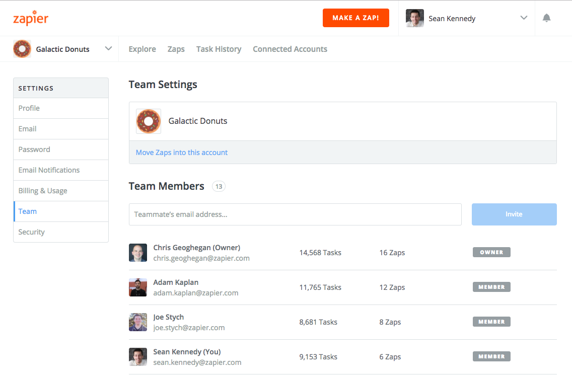 The marquee feature of this new tier, though, is that there is no limit on how many teammates can use a single team account. These teams can set up as many integrations (or “zaps,” in Zapier’s parlance) as they want. The plan comes with a maximum of 50,000 tasks per month. For Zapier, every time a piece of data is moved or an action is performed on your behalf, that counts as a “task.” Any additional tasks will be billed according to Zapier’s regular pricing schedule.