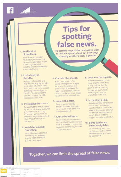 Ads in national newspapers are therefore really best viewed as Facebook trying to influence politicians, as lawmakers wake up to the power of Facebook. So maybe there should be an eleventh tip in Facebook’s false news advert: Consider the underlying agenda.