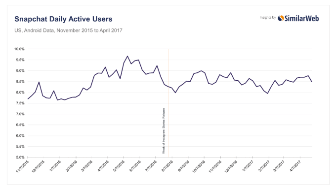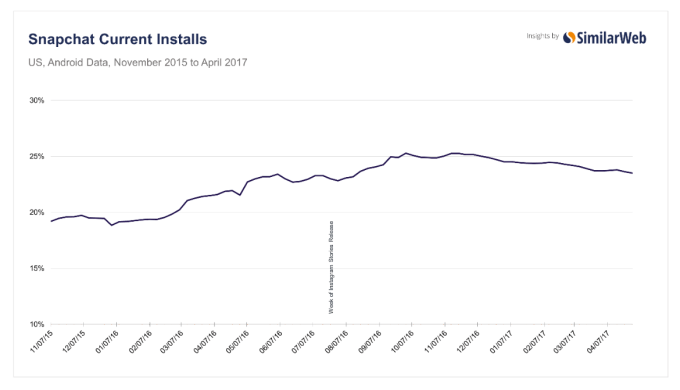 Analytics firm SimilarWeb found that the percentage of all Android devices with Snapchat installed peaked at 25.29 percent in October, shortly after Instagram Stories launched in August. That percentage has declined slightly, to around 23.5 percent.