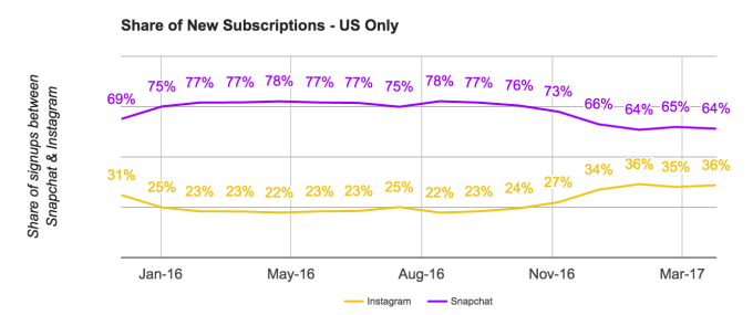Analytics firm Jumpshot found that the launch of Instagram Stories did not noticeably impact the share of email signups between Instagram and Snapchat at first, with Snapchat holding steady at around 76 percent. But as Instagram Stories gained steam by the end of 2016, Snapchat’s percentage shrank to 64 percent.