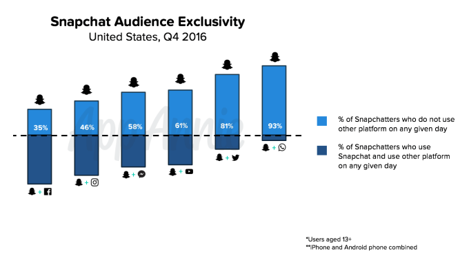 Analytics provider App Annie found that Snapchat hosts an exclusive audience that often can’t be reached by advertising on other platforms, as previously reported by Bloomberg. On any given day in the U.S., 35 percent of daily Snapchat users can’t be reached on Facebook, 46 percent can’t be reached on Instagram and 58 percent can’t be reached on Messenger.