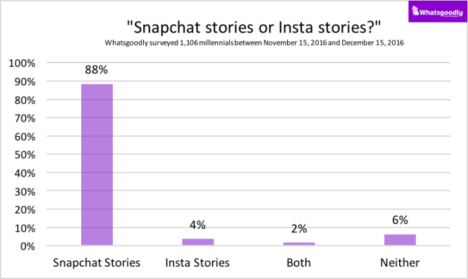 Consumer insights platform Whatsgoodly surveyed 1,991 millennials in April and 1,106 in November. It found that Snapchat was overwhelmingly preferred over Instagram Stories, but the percentage that picked it fell from 88 percent in November to 78 percent in April.