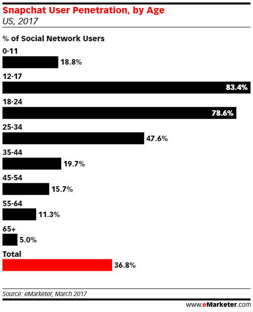 eMarketer estimates that Snapchat’s revenue growth will decline significantly in 2017 and 2018. It grew 492 percent from 2015 to 2016 when it hit $340 million in ad revenue. Revenue is projected to hit $895.5 million in 2017 as the rate drops to 163.3 percent, and $1.7 billion in 2018 with the growth rate falling to 90 percent. Still, 90 percent is a solid growth rate, and the decline is to be expected as Snapchat’s business matures. eMarketer did find that Snapchat has a massive 83.4 percent penetration rate amongst 12 to 17-year-olds in the U.S.