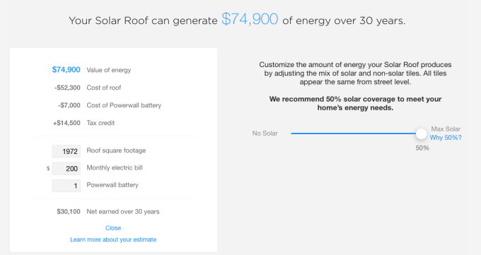 Tesla is tapping Google’s Project Sunroof here, which uses some 3D mapping trickery to give them a rough idea of how much roof area (square footage) you’ve got, and how much of it is actually good for solar use. That gives them a ballpark estimate for the roof cost (including materials, installation and the cost of removing your old roof), at which point they factor in the cost of a Powerwall battery. Then they wrap in offsets like local tax credits and the money saved on your electric bill to give you a final cost after 30 years.