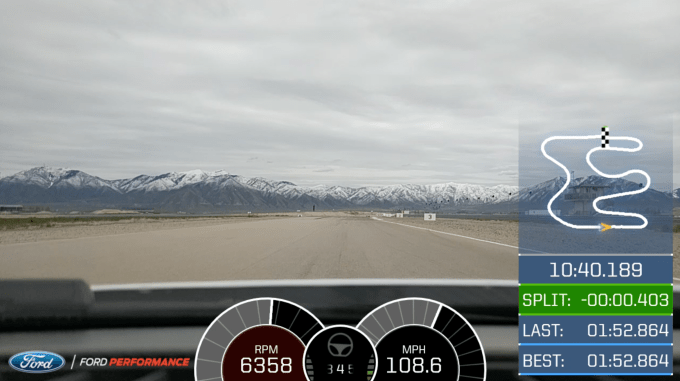 But speaking of technology: Ford is launching a Performance racing companion app, and it’ll be exclusive to the GT at first. You pop open the app on your phone, plug it into the car via USB, and it acts as a super purpose-focused GoPro. It records video, all while pulling speed, gear, and GPS data straight from the engine. At the end of your laps, it dumps it all out in a straight-to-Facebook-ready video, complete with lap times and a video game-style map of your realtime position as you blast around the track. Ford’s not the only one doing this (Chevy has something in a similar vein with their Performance Data Recorder), but it’s a nice touch and hopefully it trickles down to their other vehicles quickly. Here’s a screenshot from one of the videos:
