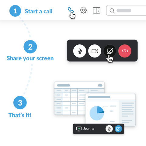 To use Slack screensharing, fire up a video call then hit the screenshare button. You can select your preferred screen if you’re using several, your webcam will deactivate, and Slack notifications won’t appear to avoid exposing any private info. Viewers will see all of your shared screen including your cursor so you can easily point things out.