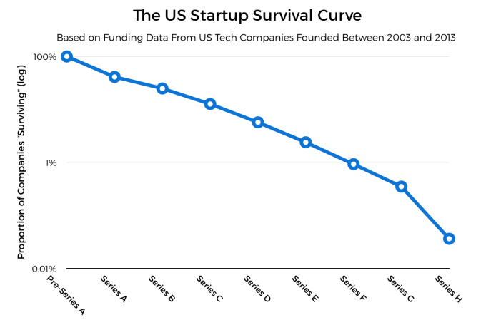(This is the same data as the chart from above, just displayed on a scale that helps to show the near-exponential decline in the population of startups moving through the fundraising cycle.)