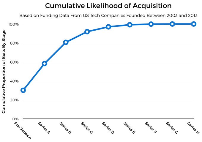 Here’s what the cumulative distribution of acquisitions looks like, starting with companies that didn’t raise anything beyond Pre-Series A funding all the way through those that closed Series H rounds: