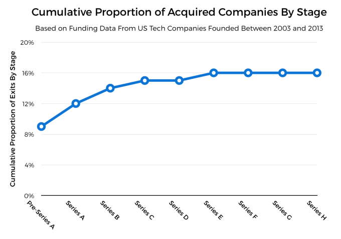 The proportion of the total startup population that winds up getting acquired maxes out at around 16 percent at Series E-stage companies, with only the slightest variation after that. Ultimately, roughly one in six companies in our data set ended up being acquired to date.