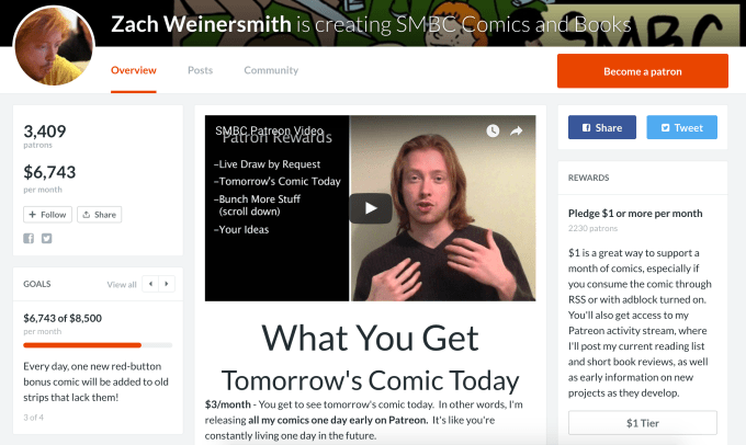 Yet on Patreon, contributors frequently cough up $5 per month to each of their favorite creators, who make 50X to 10,000X more per fan than on ads. In exchange, creators offer the art they’ve made that month, reserving premium access and rewards to those who pay more. Thirty-five creators made more than $150,000 in 2016, and thousands earn more than $25,000 a year.