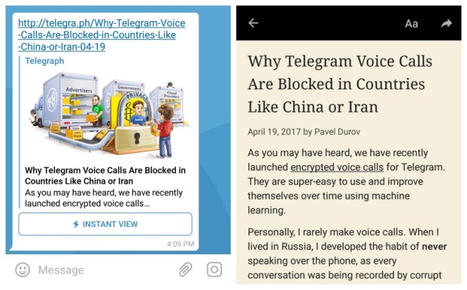 The feature launched last November to offer a quick-loading and Telegram-optimized interface for reading websites, not unlike Google AMP and Facebook Instant Articles. Previously, it used a limited layout option for links, but now Telegram has outed its Instant View Platform to enable unique designs.