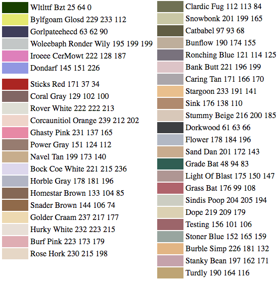 A few more runs through the data and the network was ready and willing to produce highly creative and original names for colors, far more adventurous than your garden-variety “greige” and “royal purple.” Let us survey the results.