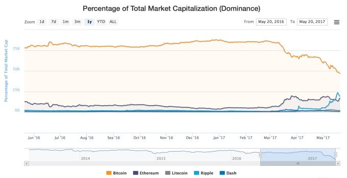 The result of these increases is that bitcoin no longer constitutes the majority of the market cap for all cryptocurrencies. Today the total market cap of bitcoin represents just 47% of total cryptocurrencies – up until a few months ago it consistently hovered around 80%.