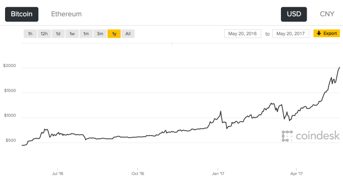 When we wrote about bitcoin (and ethereum) hitting all-time highs back at the end of April, you could buy a bitcoin coin for $1,343. Now, some three weeks later, the valuation is up 50 percent. The price of a coin rose 12 percent over the past week alone.