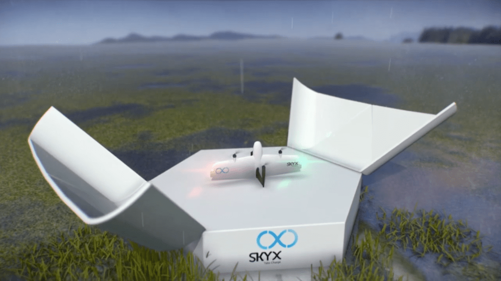 SkyX has developed proprietary SkyOne drones that employ a fixed-wing design and helicopter-like features to take off and land on small charging stations set up in the fields alongside oil and gas pipelines. The stations shelter the drones from bad weather and theft while charging them.