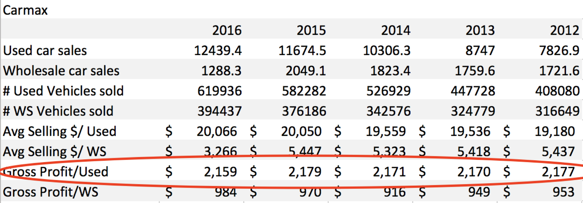 The extraordinary thing about Carmax is that the Company’s gross profit per used car sold basically doesn’t change even when the year’s average price per car sold moves up or down by 5 percent in any given year. Which means that Carmax is actually less focused on their take-rate per car, but instead focused on their profit per car; their commission is a function of the profit they expect to earn.
