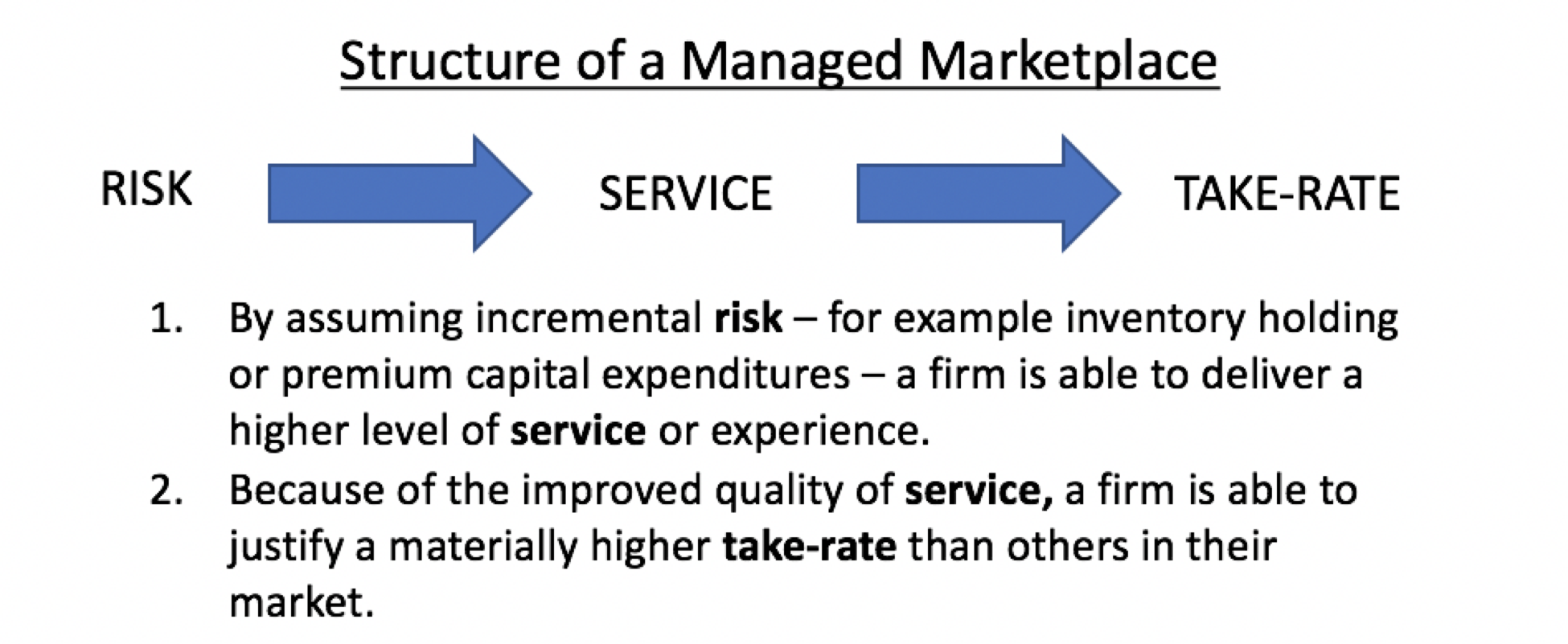 - A take-rate (gross margin) that is a significant premium versus other buy/sell options in the market in order to offset the premium service level or risk transfer that has occurred.