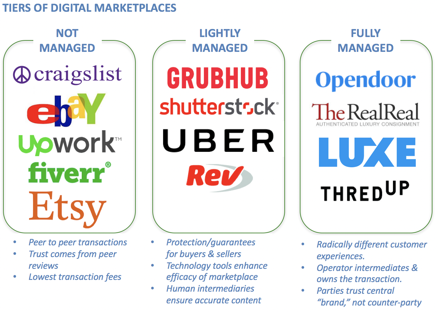 It’s important to note that many of today’s ubiquitous marketplace companies such as Uber, Airbnb, Grubhub and others are “lightly” managed, by which I mean they invest resources in quality assurance, background checks and verifying reviews. But these services are typically a de minimis expense on the company’s overall operating cost structure — often even considered as part of the customer (or merchant) acquisition cost — and therefore do not classify as a fully managed service.