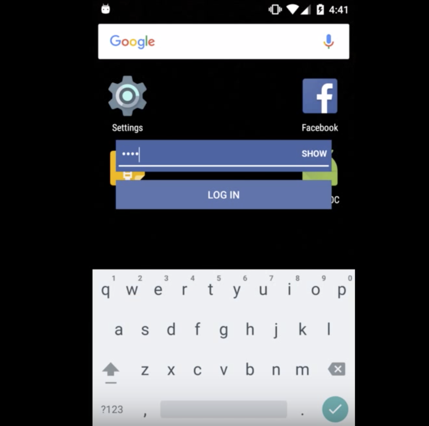 The exploit depends primarily on Android’s SYSTEM_ALERT_WINDOW (“draw on top”) and BIND_ACCESSIBILITY_SERVICE (“a11y”) to draw interactive elements over real apps. For example, in the image above, the team drew a reasonable facsimile of the Facebook password field over the real password field for the app. The user then typed in their real password into the seemingly real password field. However, when the Facebook app is closed you can see the remaining password field hanging in space.