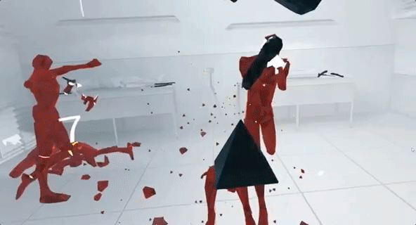 The entire game is a bit like a series of puzzles where you’re dropped in a room with a couple of weapons around you and a bunch of geometric assassins headed to kill you. Time only progresses as you physically move your body, so you have to decide the efficiency and order of your actions in order to take out the baddies before they take you out.