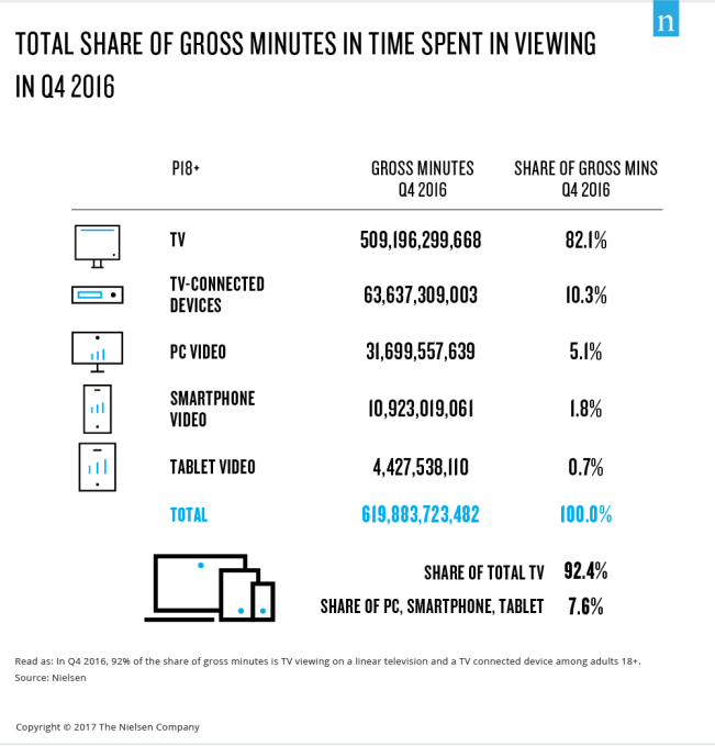 The data was collected during the fourth quarter of 2016, and compares TV screen-based viewing to viewing on PCs, tablets, smartphones, and other TV-connected devices like game consoles and streaming players such as the Apple TV, Chromecast, Roku and others.
