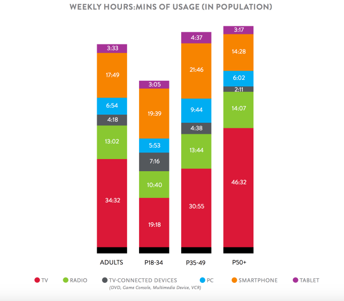 And smartphones are more heavily used among this younger group (18-34) than TV, accounting for 19 hours, 39 minutes of weekly viewing, compared with 19 hours, 18 minutes taking place on TV.