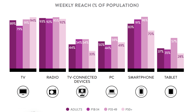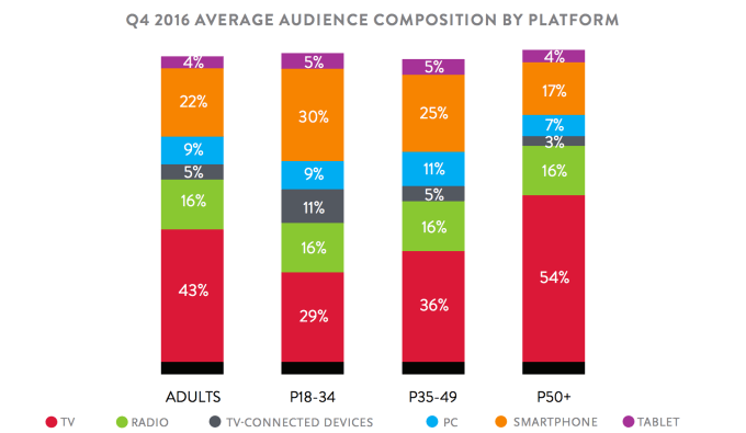 In addition, smartphones account for 30 percent of the total average audience among those 18 to 34, versus 29 percent for TV. Compare that with the older age group (50+), where smartphones only account for 17 percent, and TV 54 percent. (Average audience is defined as the number of adults engaging with the platform in an average minute during the week.)